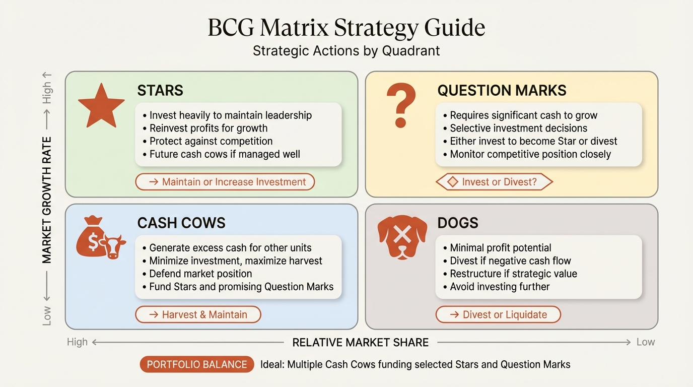 Strategic implications: Cash Cows should be "milked"—their cash should fund Stars and promising Question Marks. Investment should be limited to what's necessary to maintain competitive position, not to chase growth that doesn't exist.