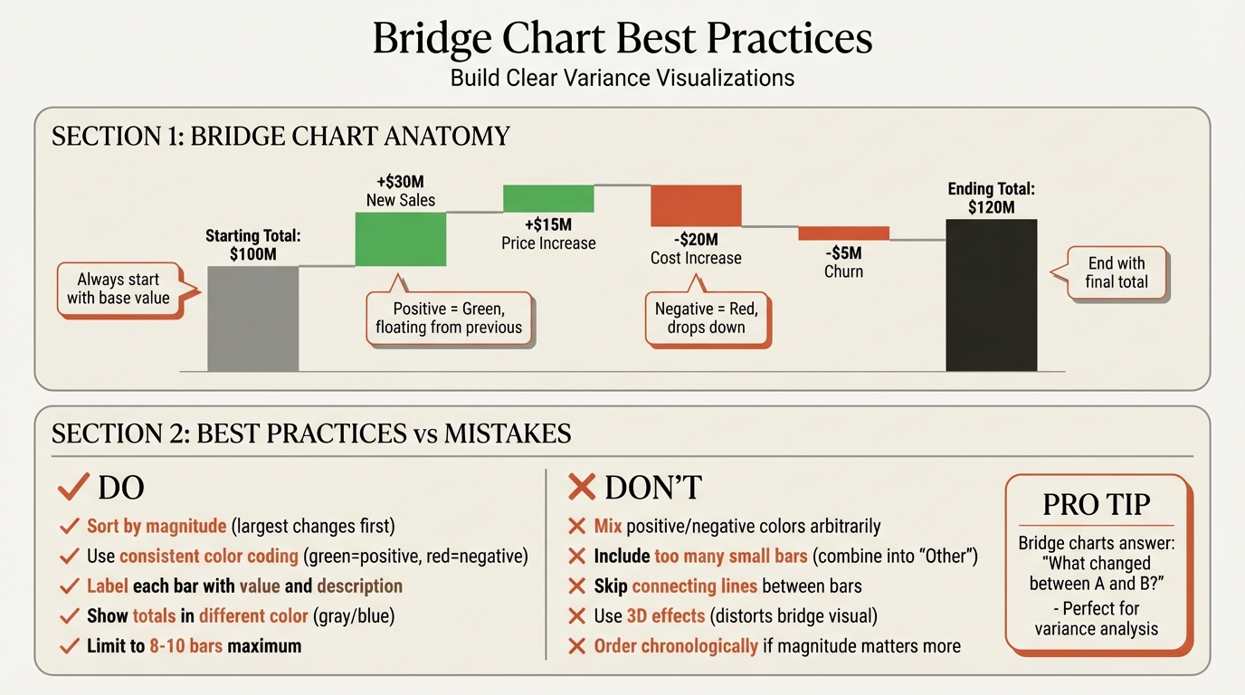 Bridge charts are the consulting standard for explaining financial change. When built correctly, they replace complex variance tables with instant visual understanding.