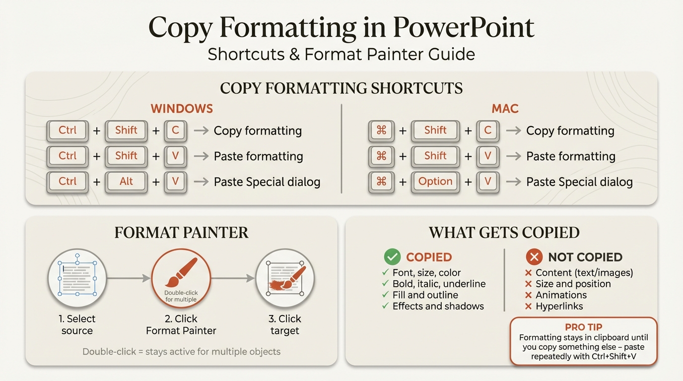 Master the Format Painter and copy formatting shortcuts in PowerPoint. Learn Ctrl+Shift+C/V, Paste Special, and pro tips for Windows and Mac.