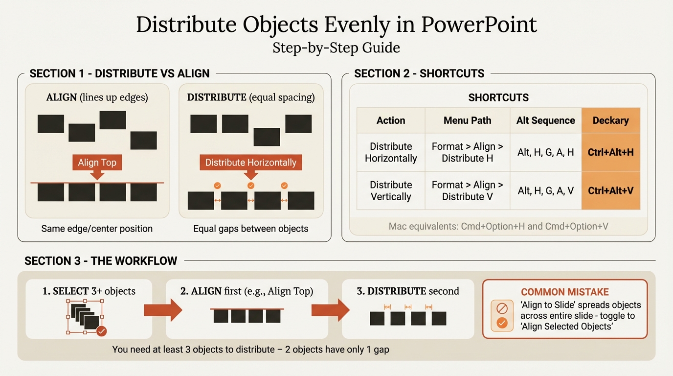 This guide covers how to use PowerPoint's distribution tools: native menu methods, keyboard shortcuts for Windows (the Alt key sequences) and Mac, the difference between "Align to Slide" and "Align to Selected Objects," and common mistakes that cause distribution to behave unexpectedly.