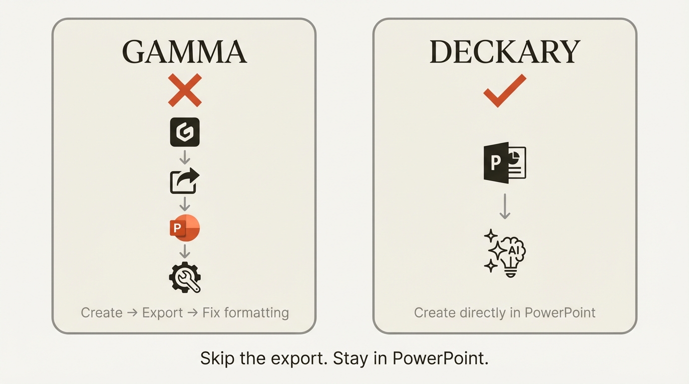 Gamma creates impressive AI presentations. It also requires you to leave PowerPoint entirely, work in a separate platform, and then export back with formatting issues.