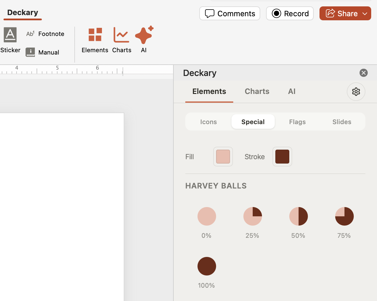 Deckary's icon library includes Harvey ball sets alongside 600+ business icons. Insert with consistent sizing and adjust colors to match your brand. $49-119/year with Mac + Windows support.