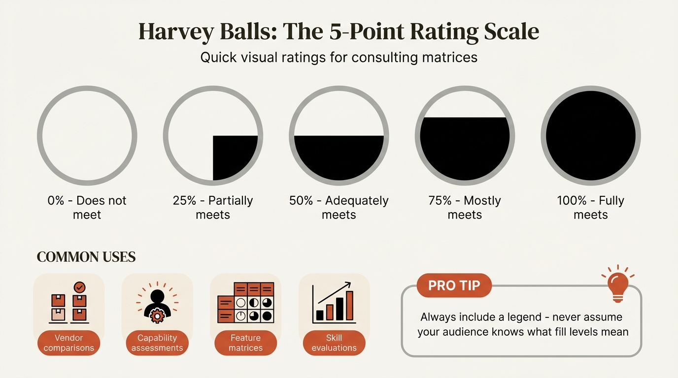 Vendor comparison matrices live or die by scannability. When a procurement team reviews 8 vendors across 12 criteria, they cannot parse 96 text cells quickly. Harvey balls solve this by converting qualitative assessments into visual patterns. A column of mostly filled circles signals strength. A column of empty circles signals weakness. The evaluation becomes visible at a glance.