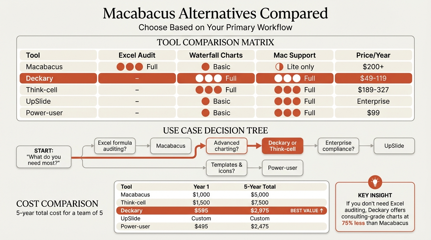 For most consultants and advisors, Deckary offers the best value. You get waterfall charts, Mekko charts, Excel linking, keyboard shortcuts, and an icon library at $49-119/year. That's roughly one-quarter of Macabacus pricing for the features most presentation-focused professionals actually use.