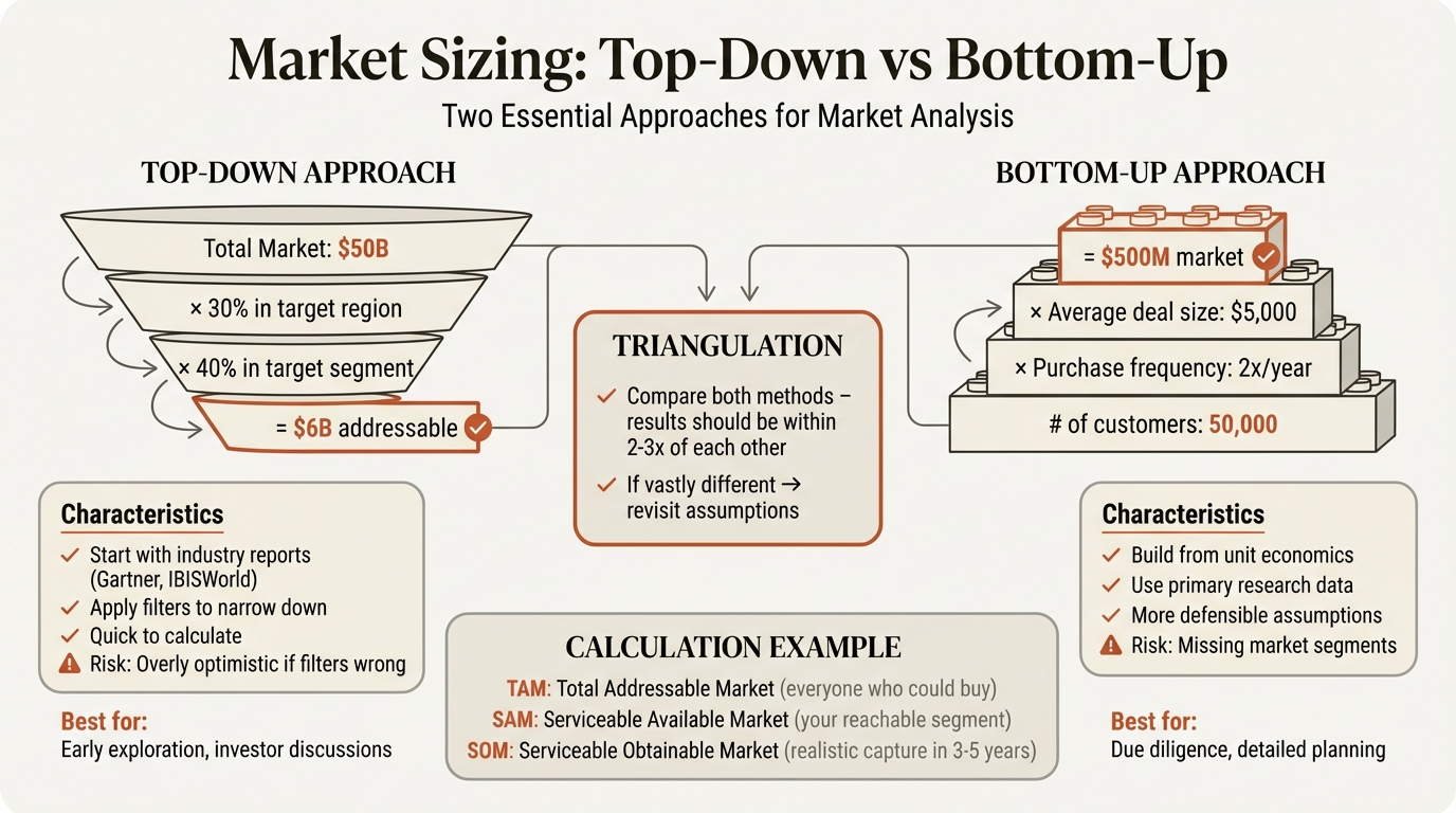 Bottom-up beats top-down. For investor presentations and strategic decisions, bottom-up calculations are more credible because they show customer understanding.
