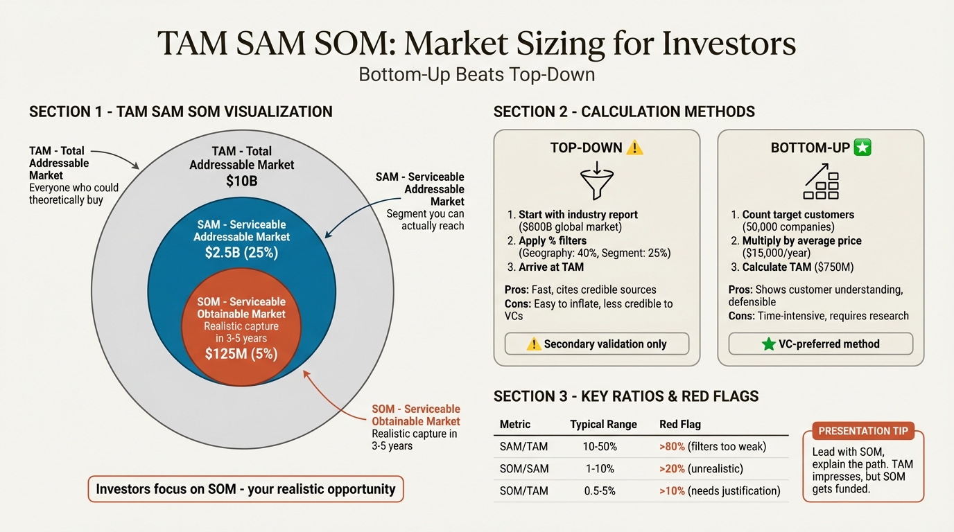Keep SOM realistic. 1-5% of SAM is credible for most startups. Claims above 10% need strong justification.