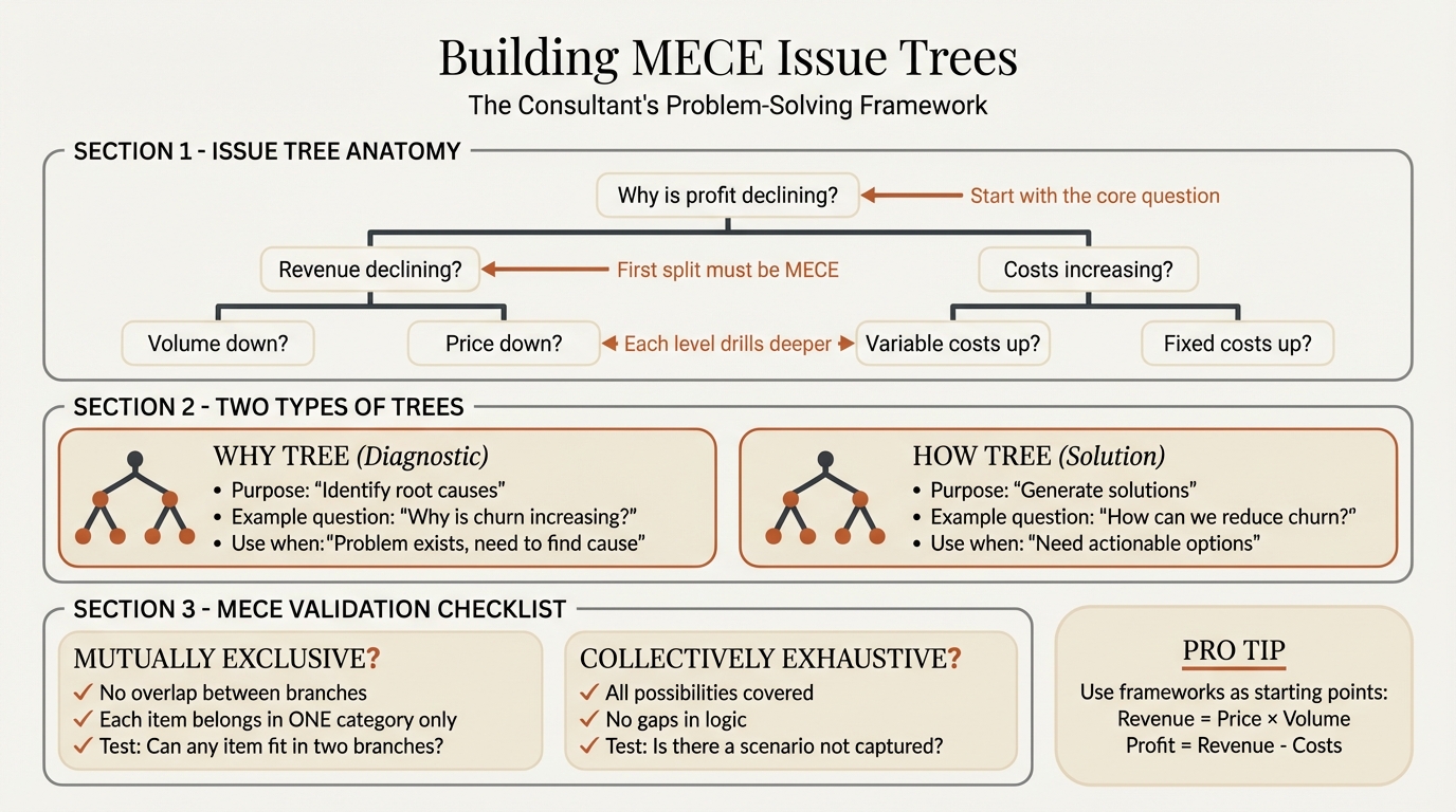 | Issue Trees | Visualizing problem breakdown | MECE applied visually |