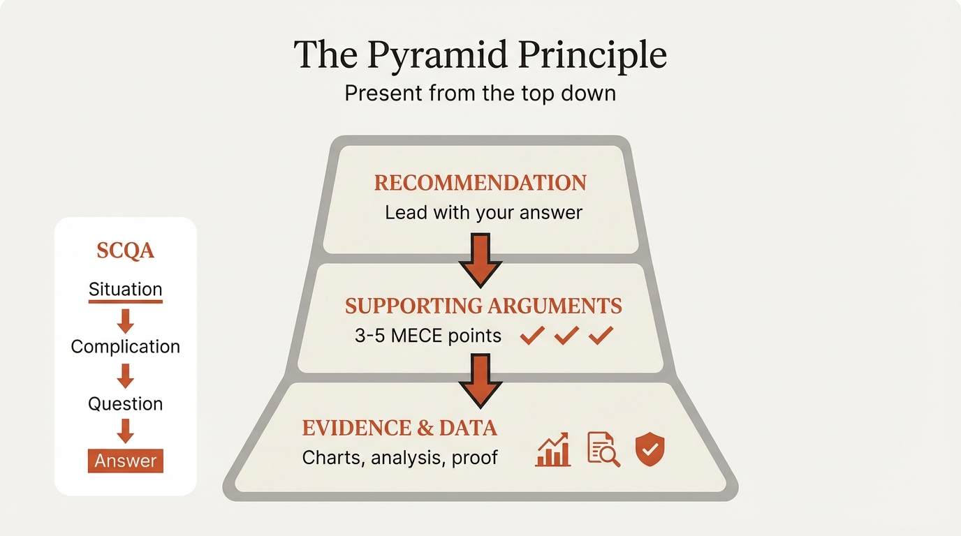 The Pyramid Principle respects your audience's time and cognitive load. It says: "Here's what I recommend. Here's why. Here's the evidence. Ask me anything."