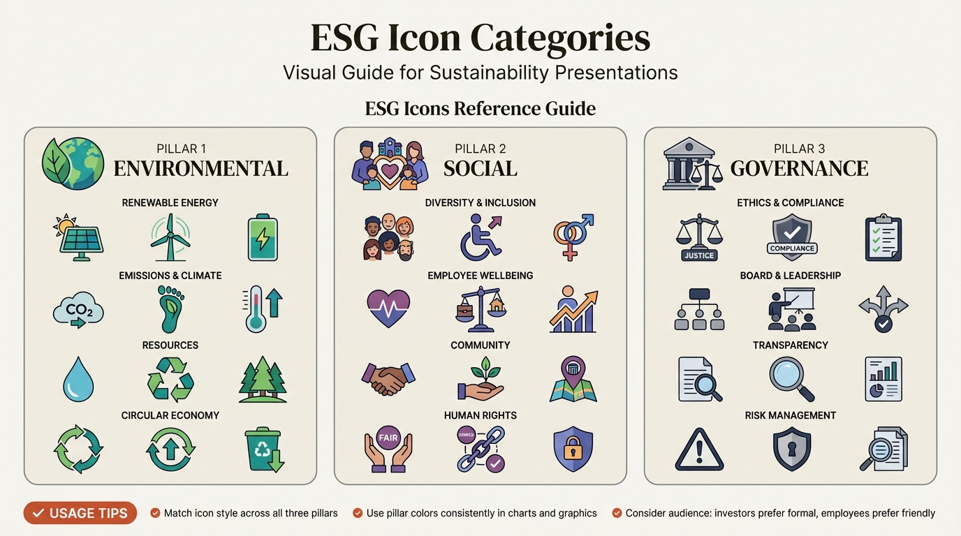 Sustainability presentations require icons across multiple categories. Here is what to include in your ESG icon library: