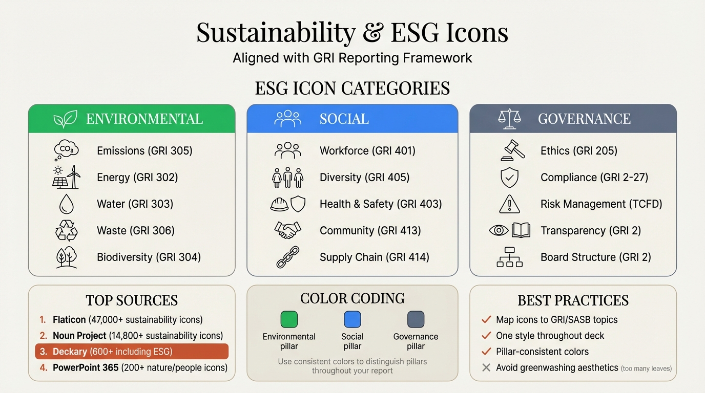 Source efficiently: PowerPoint 365's built-in icons work for basics. For comprehensive ESG coverage, Deckary's 600+ business icons or specialized sources like Flaticon provide broader selection.