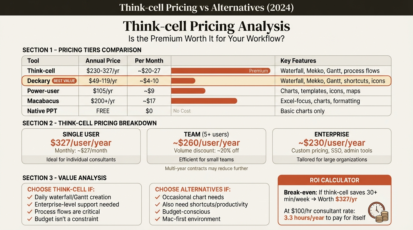 The question isn't just what Think-cell costs—it's whether the cost matches your usage pattern. For consultants building waterfall and Mekko charts daily, Think-cell is worth the investment. For those building complex charts weekly or monthly, alternatives like Deckary offer similar capabilities at $49-119/year.